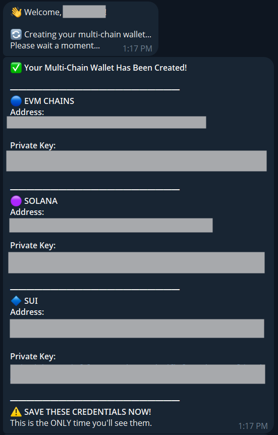 * **Save your private keys right away** – You'll see addresses for EVM chains (like Ethereum/Base/BNB), Solana, plus the private keys. **This is the ONLY time the bot shows them.** Copy-paste them somewhere super safe (encrypted note, hardware wallet backup, etc.). Never share them!