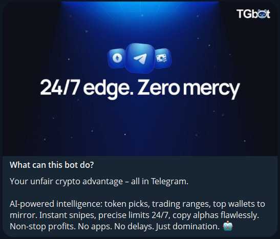 TGbot is a **multi-chain trading bot** built for Telegram. It gives you a lightweight, powerful wallet and trading tools without ever leaving the app you already use every day. Think of it as having a mini exchange, a smart wallet, and even a little research helper all in one chat window.
